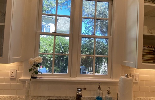 the kitchen is outfitted with premium appliances and sub-zero refrigerator Granite countertops and under-cabinet lighting create a light and bright kitchen equipped with all of the necessary everyday accessories. New white dishware and glassware allow for wonderful entertaining. The backyard has a sitting area and a dining area, with gas barbeque. The slate patio, comfortable furnishings, vintage bistro lights and olive tree provide an inviting outdoor living space. Enjoy your morning coffee or evening happy hour in the backyard or the front porch outfitted with two chairs and a table.