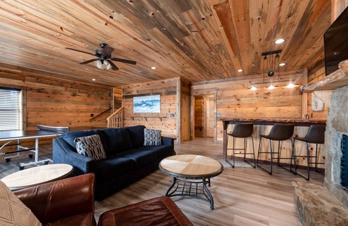 the lower level is where the fun hides, a ping-pong table and full wet bar are sure to be the main hang out spot Watch the game on our 43" 4K Smart TV and enjoy a fire in the gas fireplace... yes, there are THREE fireplaces! The sofa sleeper allows for more friends to join in the fun. Outside on the lower deck, the 6 person hot tub is perfect for those chilly nights stargazing or watching the incredible sunsets. The third bedroom is on this level and has a king bed, club chair and chest of drawers, if you're staying a while. A third full bath with a shower/tub combo wraps up the lower level..