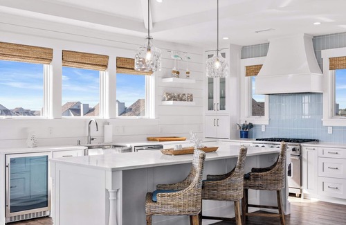 this gourmet kitchen could win the best on island award with the attention to detail one rarely finds in a vacation home Fully stocked - just bring your food - you will find the chef in you group will be inspired to create great meals. An XL center island with beautiful quartz countertops for meal prep and entertaining, high end stainless-steel appliances, wine cooler and a dining table for 10 sets the scene for great entertaining and family memories.