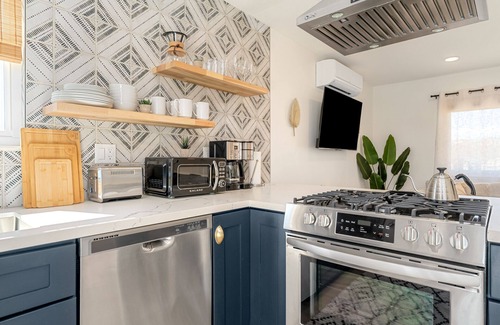 make use of the good-sized bathrooms, complete with gorgeous tiled showers, and stylish vanity This bright space is the perfect place for unwinding after an energetic hike through Joshua Tree National Park.