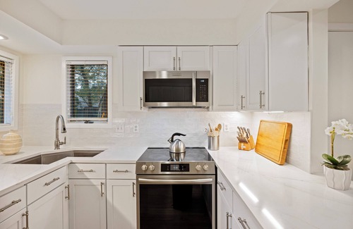 this lovely property has been updated with smart tvs, new flooring, paint, furniture and lighting The fully-equipped kitchen boasts granite countertops and stainless steel appliances. For those who might need to work remote, there is a desk with a monitor and the property has complimentary WiFi. The open floor-plan and sectional sofa are ideal for relaxing and spending time with others. And when your ready to retire for the evening, each bedroom features a king-sized bed and a private bathroom.
