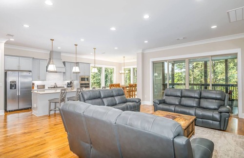 Our brand new home was designed, built and furnished for groups of 8 to enjoy. Morris combines the luxurious amenities of 5 star hotels with the comfort of a family home. It is the perfect place to stay with family or friends. The location is quiet and peaceful, overlooking the 6th hole of the Lake golf course at Grand National. Watch the deer creep out at sunset while sipping your favorite beverage, shoot pool, play poker, or relax watching sports on the 75" TV. We offer 4 master suites, 8 queen beds, walk-in showers, Brunswick pool table, 3 leather sofas and a putting green outside. The modern kitchen is fully equipped for preparing delicious home cooked meals or let our personal chef do that for you. PLUS - Enjoy the Marriott Resort Amenities including two swimming pools, hot tub, gym, tennis courts and more. The hotel is a short walk away from our front door. We tried to think of everything a group would want on a golf trip with friends or family, and included that in our home. The pricing is based on 8 guests, but we allow up to 12. Each additional guest is $125 plus tax, per night. Upon request, we will set up nice air mattresses and linens for the extra guests. The Morris house is next to Mickelson, with each house sleeping 8 - 12 adults. Rent both houses to accommodate up to 24..