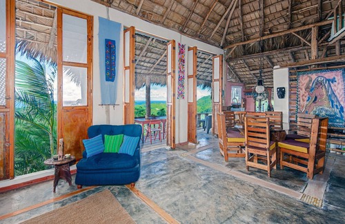 Casa Algana is located in Agua Sabrosa on the Peninsula of Samana in the Dominican Republic. This Tropical dwelling rests on a lush green hilltop that has a beautiful 180 degree panoramic view of the blue Caribbean Sea. There are not many places with this kind of magical vista in the entire world.! This is a two bedroom home. The Master bedroom comes with many builtin closets and a King size bed from where exists a picturesque view of a small Island in a distance. The other Bedroom , with a queen size bed, can be reached by ascending a winding spiral staircase. The fully equipped eight windowed kitchen has views of the sea and the mountains where the cacao and coffee grow. It has all dinnerware necessary for 8 people. This Casa comes with a very large open living room and dinning area. There is a back deck off the space where one can relax and watch a beautiful colorful sunset or sun rise over the mountains. There is an wash area with a utility sink and washing machine. This spacious place has two full bathrooms with water that is pumped from an existing clear natural spring on the land. This house is completely self sustentable with seven solar panels that give you more than enough energy for what you need. Also there is a swimming pool that completes this perfect vacation spot in Paradise! There is always a dream tropical breeze that travels through this timeless land of coconut palms ,mango trees and other wild plants and fruit trees. The house it’s located near two spectacular beaches. If you need quiet this is the place to be. If you need some activity or dinner you can drive 25 minutes and arrive to Las Terrenas where you can find many restaurants and bars. The life here is for people who want to rest , contemplate or take a walk to the beach. If you need to get away, from your Busy Life, this is perfect for you!.