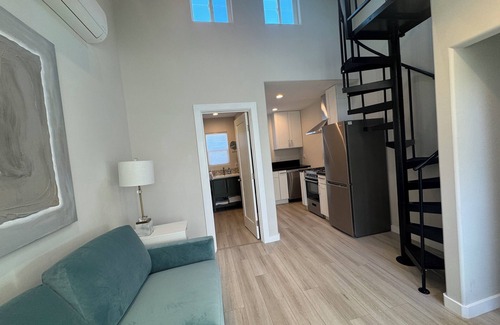 Brand-new, fully-furnished cottage! This sleek, free-standing Casita features an open-plan living room and fully-applianced kitchen, plus an airy sleeping loft with a queen-sized bed (accessed via a spiral staircase; note - limited head room). There's also an ultra-comfy, full-sized pullout couch for those who prefer sleeping on the main level. The bathroom is spa-like and spacious, with a glass enclosed shower. Outside is a private 12’ x 16’ backyard with shaded outdoor dining, a laundry center, and oversized custom artwork.