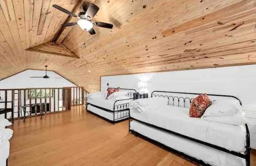 one king and one queen bedroom plus large loft space that can sleep an additional 5 people in 5 single beds Two bathrooms, one on suite master with a tub and shower and one with a shower. There is also an outdoor shower. You will have full access to the property and the pool which would be shared with the other house on the property.