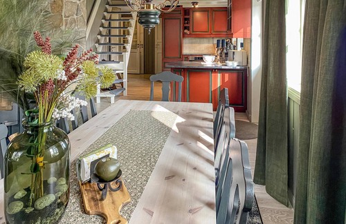 enjoy an exclusive mountain vacation by the lake, nysætervatnet! this luxury cottage in beautiful natural surroundings welcomes you and your large family The child-friendly cottage offers you a number of perks and is a great fit for those who prefer both a prime location and high living comfort. Inside, the house surprises with a striking color mix of complementary red and green, which creates excitement in the interior and cozy warmth. The whole group will definitely feel at home here. Maybe you are celebrating something special? At the long dining table you can host a birthday party or simply enjoy wonderful brunches and evenings with delicious food. During the day, sit back on the large open terrace and relax in the lounge furniture. End the day with grilled delicacies in the open air.