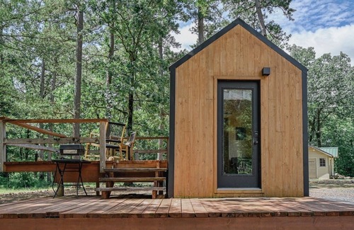 discover a quiet escape in our nordic tiny house, nestled among the trees and bordered by the national forest Designed for simplicity, comfort, and connection to nature, this retreat accommodates 2 guests with one cozy bedroom and bathroom.