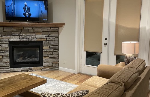 upstairs are the two primary bedrooms, each with its own ensuite bathroom and a washer/dryer if needed to do laundry The Master bedroom has its own patio with sun loungers overlooking the Bow River & Calgary skyline. It is also equipped with a walk-in closet, TV and its own fireplace.