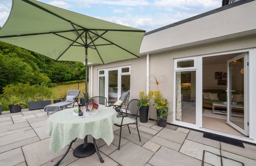 outside: large paved patio with garden furniture and extensive views across the valley, adjacent ponds, stream and garden