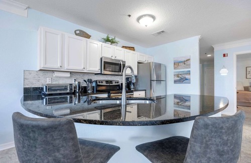 back indoors, the spacious kitchen is fit for a crowd, featuring stainless steel appliances, glossy stone counters, and crisp white cabinetry stocked with all the comforts of home Snag a high-top stool at the counter for casual bites or gather around the dining table, seating 6 for more formal fare.