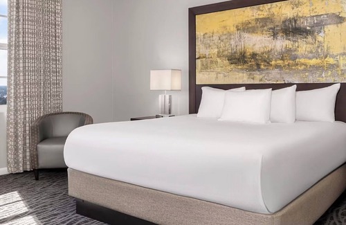 the 1 bedroom deluxe features a king bed in the private bedroom, a queen sleeper sofa in the living area, and one full bathroom A full kitchen includes a coffee and tea maker, microwave, refrigerator, oven, dishwasher, stove, toaster, cookware, flatware. General room amenities include washer/dryer, high speed wireless Internet, iron and ironing board, and cable TV. Balcony varies based on Suite assigned.