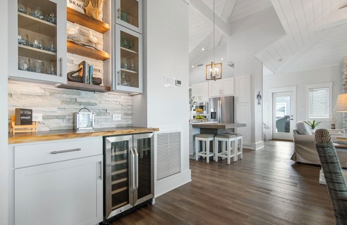 Oceanfront home on South Beach. Immaculate ocean views from entire second floor. Upper level features a reverse floor plan with master bedroom and ensuite with soaking tub, great room, and expansive kitchen. Lower level features 3 bedrooms with private ensuites, a fourth bedroom having shared bathroom with a 4-bed bunkroom. A Good Vibes stay includes two 6-person golf carts for traveling around the island. Golf, pool, water slide, tennis, pickleball, fitness, and multiple dining options available via a Lifestyle Level Guest Membership to the Bald Head Island Club (additional guest fees apply), and many other amenities listed below..