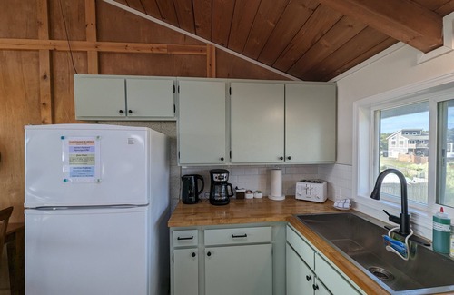 the upper level is an open floor plan - living room, dining and kitchen Enjoy ocean views while cooking, eating, playing a board game or watching TV. The wood stove (wood provided) adds to the atmosphere on a winter coastal night.