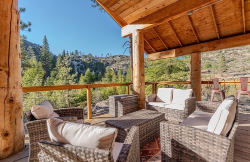 waterfall retreat at peppermint falls ranch offers a peaceful, off-grid escape nestled in the heart of nature This charming cabin, surrounded by towering pines and mountain views, is perfect for those seeking tranquility and adventure. The spacious deck, complete with cozy seating and a hammock, is ideal for enjoying the fresh mountain air and breathtaking scenery.