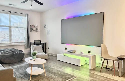 Relax with the whole family at this BRAND NEW peaceful 1 Bd/1 Ba getaway. Choose your favorite movies to watch on your very own 100 inch projector screen. Comfortable futon couch and lounge chairs in living room. Comfortable memory foam queen bed and queen air mattress with large 4K TV in bedroom. Close to nearby restaurants and shopping. Close to interstate 65 & 465.