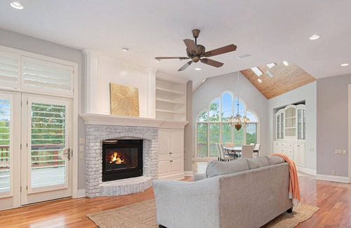 additional amenities include wifi and cable, air conditioning, two laundry rooms(each with a washer and dryer) for your convenience, several balconies, and decks to enjoy during your outside time, a barbecue grill, and a lush green lawn, pets are considered, and children are welcome There are also 4 garage parking spaces available for guests, and additional driveway and street parking.