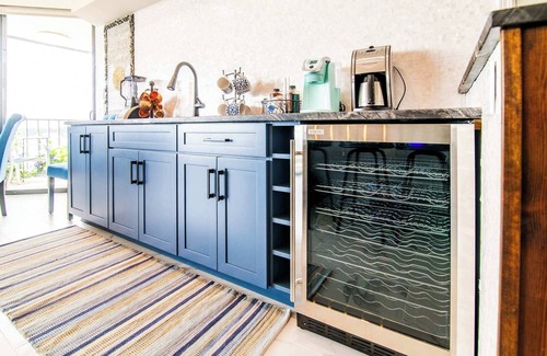 the bar area also has a refrigerator for your favorite beverages as well as beautiful stemware, bar glasses to make your beverages all the more enjoyable