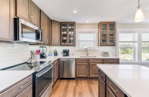 start your morning in the modern kitchen with barstool seating, the place for brewing your coffee before stepping onto the covered porch to soak in the peaceful sounds of nature After a sun-soaked day at the Outer Banks' pristine beaches, unwind with a glass of wine on the porch or gather in the stylish, coastal-inspired living room to plan your next adventure. The open dining area is ideal for enjoying meals together, creating unforgettable vacation memories.