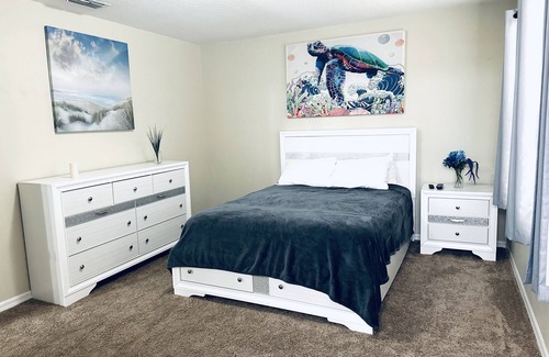 after the day's adventures, unwind in the living room with shows and movies on the smart tv The sparkling, full kitchen boasts of stainless steel appliances. Prepare meals here will all your essentials, as well as a dishwasher for easy cleanup. The dining area is perfect for sharing these dishes as well as playing board games for some friendly competition. Retreat upstairs where you'll find your rooms, including themed bedrooms for the little ones. Modern must-haves include central air-conditioning, free WiFi, and a private washer/dryer..