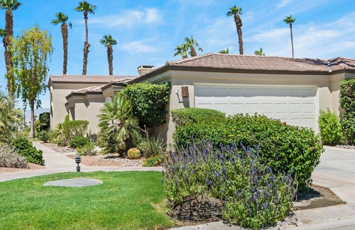 Welcome to our luxurious condo at Palm Valley Country Club in beautiful Palm Desert! Located on Sweet Pea Way with 3 pools close by. We are Platinum members which means you can enjoy the golf, tennis, pickle ball, gym, club house facilities at a guest rate! This stunning getaway was originally the model home, offering you a truly exceptional experience. Recently completely repainted, new couches and a gorgeous Saatva King Bed in the primary sweet! With 2 bedrooms each have king beds and ensuite bathrooms, a den, and another half bathroom for guests! There's plenty of space for you and your guests to relax and unwind. Situated on the 9th fairway, you'll be treated to breathtaking views of the pristine golf course right from your doorstep. Immerse yourself in the tranquil ambiance as you sip your morning coffee or enjoy a glass of wine in the evening on the private patio. IF YOU NEED TO BOOK MORE THAN 27 DAYS PLEASE MESSAGE US AS SHORT TERM TAXES DON'T APPLY..