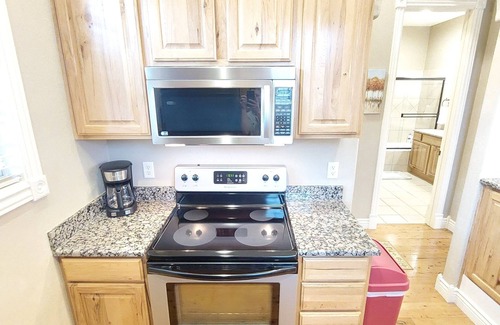 we personally clean, manage, and maintain this property to ensure everything is perfect for your stay! this beautiful suite has a log cabin exterior and has been gorgeously remodeled It also includes all new furnishings from Nebraska Furniture Mart. This spacious property boasts all the comforts of home with two Serta king-size mattresses, stainless steel appliances, washer & dryer, electric log fireplace, fully equipped kitchen (including all dishware, cookware, and utensils), premium coffee maker (all supplies provided complimentary), spacious living room with tall ceilings, over-sized jetted tub, and two ceramic tiled showers.