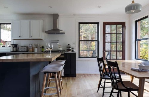 built in 1850, this home has been renovated to enjoy all of the perks of modern amenities while retaining its original charm You and your friends or family will love lounging in the open concept main living space, with windows that look out over the backyard, creekside deck and fire pit while enjoying the sound of the babbling stream coming through the windows. The living room includes two full size couches and upholstered ottomans with plenty of space to cozy in and watch something on the 55” Roku TV. There are plenty of free options on the tv or the option for you to log into your own subscription services to catch up on your favorite tv shows and movies. The dining room fits four comfortably for full meals or games at the property during your stay while enjoying the natural light shining in through the windows. the kitchen is well equipped with a gas cooktop and oven, toaster, dishwasher, microwave, fridge with an ice machine, coffee maker, milk frother, bar utensils and blender, as well as all the utensils, dishes, and pots and pans you could need!