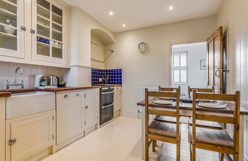 the large kitchen is a traditional farmhouse kitchen with a dining table seating up to 5 guests Use of appliances includes an oven, electric hob, fridge and freezer, washing machine and dishwasher. Smaller appliances include a microwave, kettle and toaster.
