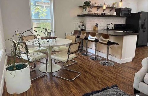open concept kitchen with bar seating, brand new appliances, including dishwasher and refrigerator with water filtration system Dining table and bar each seat 4.