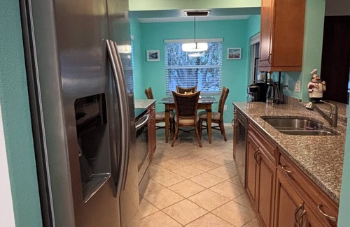 the kitchen is fully equipped with appliances, and you can enjoy a nice coffee on the covered outdoor lanai before driving out to the beach The property also boasts a private community pool accessible to renters who want to stay close to home.