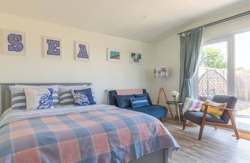 the luxurious cabin is open planned with a super-comfy king size bed and designer bedding, making you feel relaxed and at home The living area has a soft velvet sofa-bed and cushions (made by local designers, such as; Margo Selby), throws and blankets for those colder evenings, dining table/workspace and a large smart tv mounted to the wall. Perfect for a nice cup of tea or coffee in the morning on the patio. The beautiful modern bathroom boasts a walk in shower (perfect for washing off the sea salt after a morning swim), a basin & a WC.