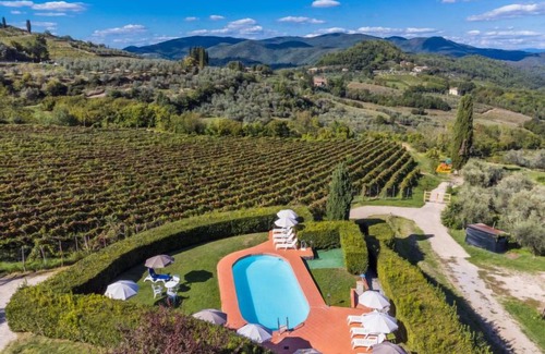 Large, rustic on a vinyard country house "Fattoria l'Ottavo", 400 m a.s.l from the 18th century, renovated, surrounded by meadows and vineyards. 3 houses in the residence. 9 apartments in the residence. In the district of Lucolena in Chianti 12 km from the centre of Greve in Chianti, 13 m from the centre of Figline Valdarno, in a secluded, sunny, elevated position, in the countryside. For shared use: property 40 ha, natural garden, meadow, swimming pool fenced (8 x 4 m, seasonal availability: 01.May. - 15.Oct. pool opening hours: 08:00-20:00). Outdoor shower, terrace, garden furniture, barbecue, pool maintenance by the owner/gardener. In the house: reception, restaurant, breakfast room, WiFi, washing machine (for shared use). Linen change weekly. Breakfast possible on request (extra). 200 m long narrow motor access to the grounds. Parking on the premises. Shop 700 m, grocery 700 m, supermarket 12 km, shopping centre 13 km, restaurant 1 km, bar 700 m, bakery 700 m, bicycle rental 12 km, bus stop "Lucolena" 700 m, railway station "Figline Valdarno" 13 km, sandy beach "Calambrone" 110 km, indoor swimming pool 13 km, lake Trasimeno 114 km. Golf course (18 hole) 20 km, tennis 12 km, riding stable 2 km, walking paths from the house 100 m. Nearby attractions: Firenze 37 km, Siena 50 km, Arezzo 54 km, San Gimignano 65 km. Please note: car recommended. Reception open 10:00-17:00 hrs. Suitable for families, baby equipment (included). Suitable for events. Local sale of farm products. Please note: the owner lives on the same property. All houses/apartments are individually designed/furnished.