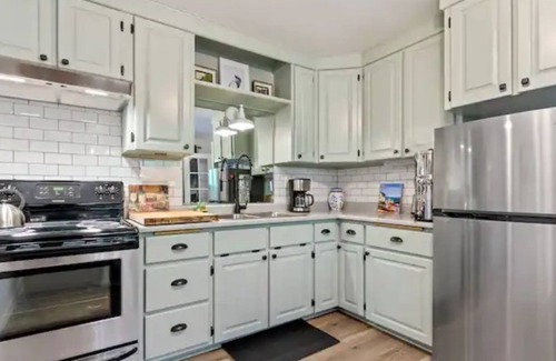 the pink guest house cottage w/private entrance & on main level of house! private patio set Lovely living room w/queen sofa sleeper, large Smart TV w/Apple TV Box Streaming (your subscription), French doors overlooking side yard & French doors into dining area! Open kitchen w/dining for 4 + Berkey water filter. Bathroom tub/shower & ample counter/storage space. Romantic bedroom with velvet drapes, antiques, comfy queen bed, plenty of closet space & chandelier! Washer/Dryer. Sleeps 1-4.
