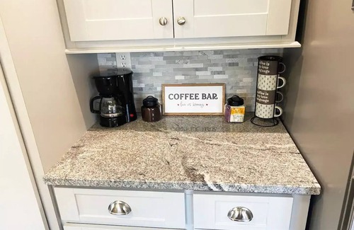 enjoy a romantic dinner for two in our eat in kitchen area equipped with romantic lighting or sit & enjoy a breakfast meal with some coffee from our complimentary coffee bar Plenty of counter space will make meal preparation a breeze. Loads of storage space in the cabinets & drawers, which is where you will find utensils, dishes, cookware, etc. Stainless steel appliances throughout. Excellent view of backyard where wildlife such as Deer, Rabbits & local Birds frequently visit. Perfect for keeping an eye on the kids while they play as you prepare lunch.