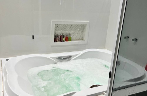 while you're here, you can enjoy all the comforts of home and more, including a jetted bathtub and wifi, as well as air conditioning and a dryer Other amenities include towels, an ironing board, soap, and toilet paper.