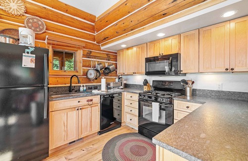 the main level of the home features an open plan living area with comfy leather couches and accent barrel chairs, an inviting wood fireplace and a flat screen tv for entertainment The kitchen is fully-equipped with modern appliances and amenities, an adjoining dining table for sharing meals and seating at the bar counter for extra guests. There are two bedrooms on the main level of the home, an inviting queen bedroom and a bunk room with custom queen bunks, sharing a full bathroom with a shower and bathtub. The upper level loft area is home to a luxurious king master suite with a private bathroom. There is a laptop friendly workspace on the landing, should you need to work from home.