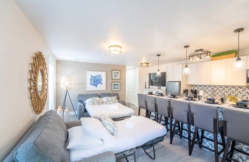 the apartment has a gathering area, the perfect cozy spot for your family you’ll love our fully-equipped open kitchen, ideal for guests to chat while food is ready!