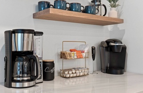 coffee bar w/ keurig, ninja drip brewer, french press & frother (coffee provided)