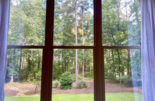 Welcome to the secret garden! This charming home in Senoia is surrounded by nature on a large wooded private lot offering exceptional privacy along with convenience to downtown Senoia, Peachtree City and Newnan. This wonderful property boasts 4 bedrooms, including 1 king bed and 3 queen beds, perfect for a group of guests. Everyone will have their own space with the master on the main level with a huge walk-in closet and 3 bedrooms upstairs including a Jack and Jill bathroom. Relax on the screened in back porch watching the deer and taking in the beautiful view or watching the patio TV while grilling out. We have a fully stocked kitchen with double ovens, stainless steel high quality pots and pans and more for entertaining your family. Put your feet up and relax on the reclining sectional sofa and enjoy the new 70in living room TV. There are 7 total TV's including the living room, all bedrooms, patio and extra sitting area off of the kitchen. This spacious custom built home is a quiet retreat that is sure to please. It is truly a rare combination of seclusion, space and convenience. Come enjoy the peace and quiet with all of the luxuries of home. we would love to have you!