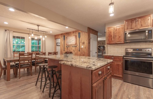 the interior offers an open kitchen with granite countertops, black stainless steel appliances, and a seven foot island You will also find granite in the bathrooms in addition to the new tile floors. The whole cabin has been updated with new furnishings to ensure your stay is as comfortable as possible. The outside is just as accommodating as the interior, with ample seating on the spacious deck and covered porch, oscillating fans to stir up a breeze on those warm days, and a small bar overlooking the covered dock and swim platform.