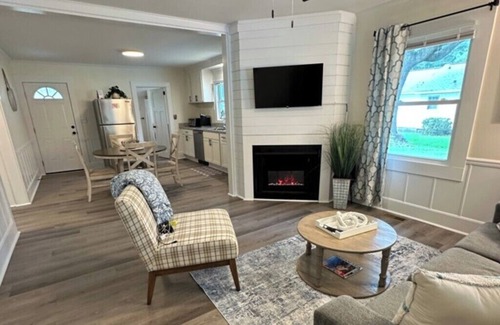 step inside to find a bright, open layout with fresh coastal-inspired décor and brand-new furnishings throughout The spacious living room invites you to relax with a plush sofa, 40" Smart HDTV, and an elegant shiplap fireplace feature wall. A fully equipped modern kitchen — complete with stainless steel appliances, granite countertops, coffee maker, and all cooking essentials — makes dining in a breeze. Enjoy meals at the cozy dining table or take your coffee to the welcoming front porch for a quiet start to your day.