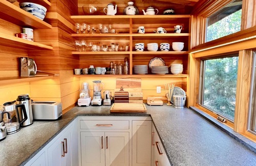 Year-round modern house near Northeast Harbor, Bar Harbor and Southwest Harbor - on Somes Sound, with extraordinary views throughout the house, in Acadia National Park. This thoughtfully designed unique property commands lovely south and westerly ocean and mountain views across Somes Sound. Surrounded by towering pines and affording plenty of privacy, Copper Top is sure to be a rental favorite with its custom woodwork, beautiful furnishings, and comfortable layout. Each bedroom has its own unique feature--making it easy to decide who sleeps where. Bedrooms are generously sized with closets, bureaus, seating and very comfortable beds and linens-- and each near a bathroom. All bathrooms are equipped powerful shower heads, towels, hair dryers, soups and grooming products.