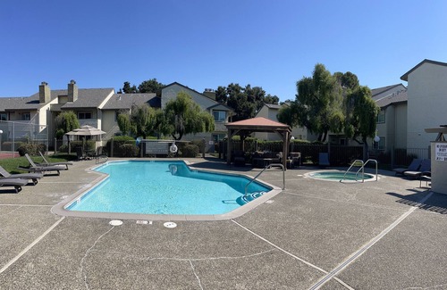Spacious and stylish pet-friendly apartment with access to a pool, jacuzzi, and gym, and complimentary bike. Fully furnished and stocked, decorated with original art. Offered at the listed price as one-bedroom apartment, a second bedroom is available for additional fee. The apartment features spacious bathroom, fireplace, in unit washer and drier, private patio. There is a dedicated carport parking space. It is in a walking distance to shops and restaurants. On a bus stop, 4 miles to UC Davis.