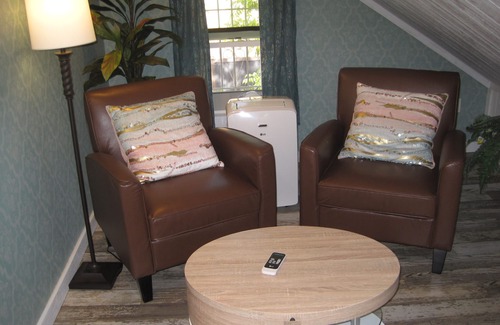 the second floor features a romantic master bedroom/ loft with beveled ceilings (Please note that the ceilings in this room are low, therefore it might be uncomfortable for taller individuals.) It does include a very comfortable king size bed, cotton bedding, down pillows, an electric fireplace, as well as an extra AC, for those that like it cooler at night. There is a cozy little sitting area for two as well.