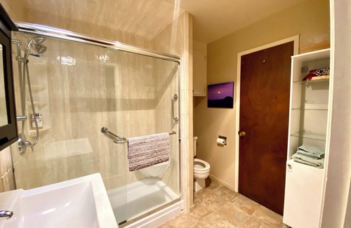 the lower level studio opens onto a deck with our vegetable garden and spacious patio The kitchenette has a sink, microwave, toaster oven, mini-fridge, double hot plate, blender and coffee maker. Fold down Murphy bed with very new Avocado queen mattress. Bed has a simple desk built in when it is folded up. There is a "Design Within Reach" couch that converts into a very comfortable king-size bed (or can be used as a twin), and the large private bathroom has a walk-in shower with seat. There is a gas wall heater that you control. There is no entertainment system or TV. For the eco-conscious and chemically sensitive: the flooring is recycled cork, paint is zero-VOC, sheets and towels are organic, and all cleaning supplies we use are non-toxic. Free very fast wireless.