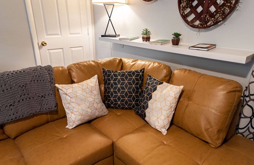 this two bedroom unit packs a punch! both the queen bedroom and the king bedroom offer smart televisions, dressers and closet space This adorable unit has an open concept kitchen and living room. The cozy living room has all the extras as well with a fireplace and a 55" smart television, leather sectional, and a desk for laptop usage. The eat in kitchen comes with the basic cooking essentials and place setting for four. Full size washer and dryer also available.