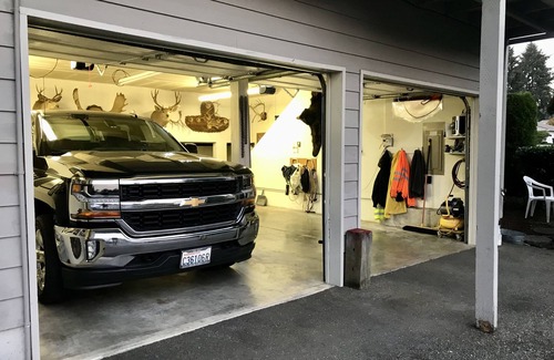 1500 sq ft 2 BR/2 BA duplex. Fully equipped Kitchen. Spacious living room. work area, & dining room.Two 70”screen TVs one 40”TV. Cable, fast WiFi. Queen beds in each BR, en-suite BA in master. 2nd BA in hall. Full size WA/Dry in laundry room. Dble Garage plus xtra parking. Close to shopping, restaurants, and quick freeway access to hospitals, JBLM, boating, and hiking. Nestled at the end of quiet a cul-de-sac. Surrounded by trees has a lg lower patio with bar-b-que, gardens and a fire pit area..