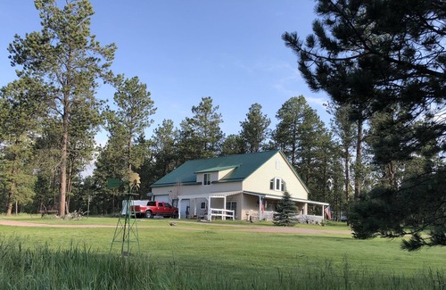 very private, with 5 spacious acreage, set back from the road 2 blocks from Highway 385, 3/4 mile south of Custer. Highly convenient, central location for day trips anywhere in the Black Hills. 3 bedrooms (one downstairs, two up) all have queen size beds. Additional sleeping space also in the upstairs loft, where you can sleep two on a full-sized sofa/futon. Main floor bathroom is handicapped accessible with spacious double basins, and includes a full size washer and dryer. Shower has a low step in for handicap access, grab rails. Master bath toilet is higher, with grab bars. No bathtubs currently. Second full bathroom (with shower) is off attached garage/shop just a few steps away. Second bathroom does not have grab bars or handicapped toilet. Electric appliances in kitchen, microwave, dishwasher, K-cup brewer and additional perk coffee pot. Huge, attached enclosed garage with parking for multiple vehicles, for protection from hail and thunderstorms. Small pasture adjacent to home for your horses (currently not fenced). Covered patio and house-length covered porch with rocking chairs and bench seating, outsized picnic table under porch shelter. Weber Gas BBQ (propane included). Depending on the season, lots of deer and turkeys on the property. Linens provided. This is a pet friendly property, but there is an extra charge for pets. Please contact us ahead of time regarding horses. Quiet and clean. Please look at the satellite view on the location tab to get a good feel for how the home and property are laid out. Road to the property from US 385 is around 1/4 mile of good grade, gravel road, with a paved gravel driveway into the property.