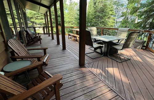 This water access only cabin is a quiet retreat from the busyness of life. Fast Starlink internet to keep you connected. Two bedrooms in the main cabin are accompanied by a full bathroom and fully stocked kitchen. The bunk house includes an upper bedroom with a queen bed and amazing views. The lower level includes two bunk beds sleeping at least four people as well as a 3/4 bath. Property includes an outhouse, outdoor shower, fire pit, two docks (one swimming, one with a lift), no steps from the water to the cabin, and 7 acres of remote forest. Cabin can be accessed via the public launch and is just a quick five minute boat ride..