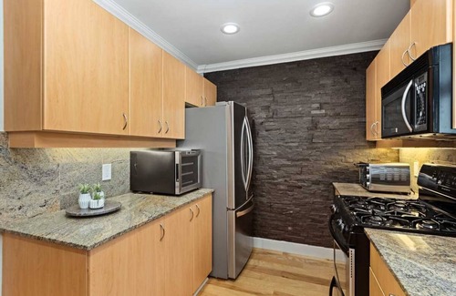 chicly appointed ground floor townhouse with secured gated street entry and an inviting front patio with seating to enjoy people-watching! upon entry, you will find a roomy open concept living and dining area decked out in warm, textured neutrals with pops of gold for a hint of glamour, with a cozy seating area around a large television Those looking to work from home will appreciate the desk with a view overlooking the vibrant streets of Little Italy. The kitchen is fully equipped for making all manner of meals, and vino lovers will be delighted by the countertop wine refrigerator. This unit features modern tile and plank flooring throughout, with the upper floor boasting two spacious bedrooms (housing a California king bed in the master and a queen bed in the guest room) with ensuite bathrooms, televisions, blackout blinds and walk-in closets.