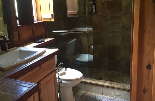 the downstairs has an open concept kitchen with granite countertops and living room The downstairs bedroom features a queen bed with patchwork quilt and exquisitely tiled bathroom with shower. Upstairs bedroom includes a king bed with small desk and sitting area along with a private bathroom. The living room sleeper couch can be used to accommodate 6 guests with limited privacy and sharing the downstairs bathroom.